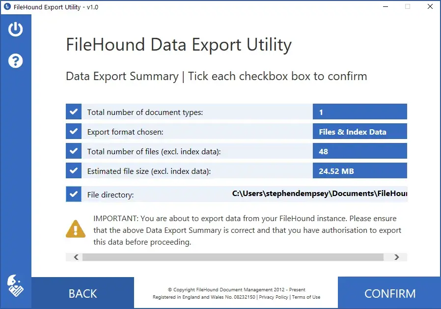 FileHound Export Utilityを使用すると、FileHoundの管理者はバックアップやリカバリのために、安全なドキュメントとデータ抽出タスクを実行できます。 このアプリケーションは、選択したフィルタにもとづいて、FileHoundに保存されているすべての文書やメタデータをダウンロードします。 メタデータはJSON形式とXML形式の両方でエクスポートされます。