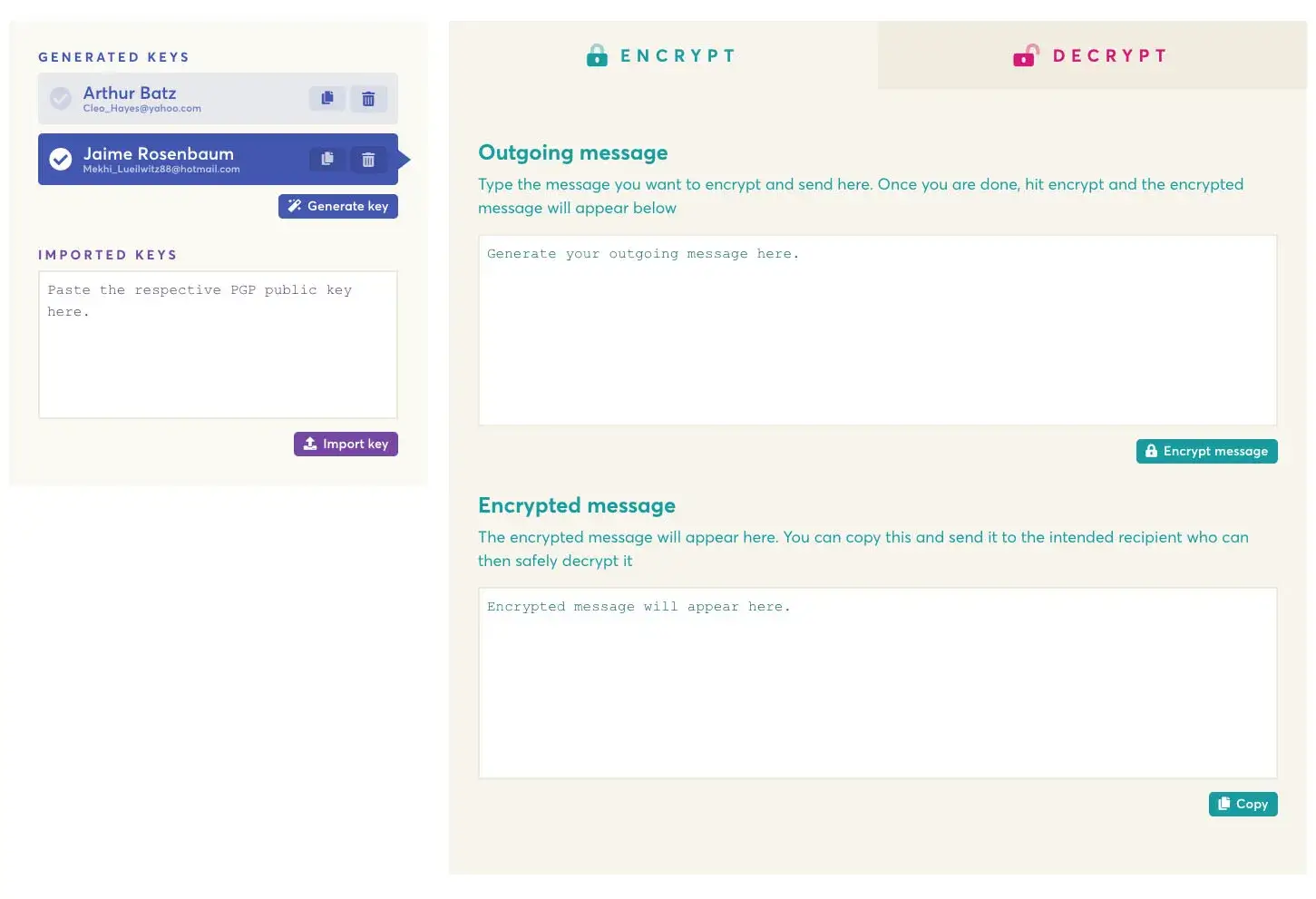 PGP를 사용한 메시지 암호화는 업계 표준입니다. 모두 개인 키와 공개 키를 가지고 있습니다. 귀하의 개인 키는 귀하만 메시지를 읽을 수 있도록 비공개로 유지되어야 합니다. 귀하의 공개 키는 귀하에게 암호화된 비밀 메시지를 보내려는 모든 사람에게 배포됩니다. 키 관리, 메시지 암호화 및 메시지 해독은 매끄러운 경험이어야 합니다. EncryptEasy는 모든 것을 쉽게 만드는 것입니다. EncryptEasy는 모든 것을 쉽게 만듭니다.